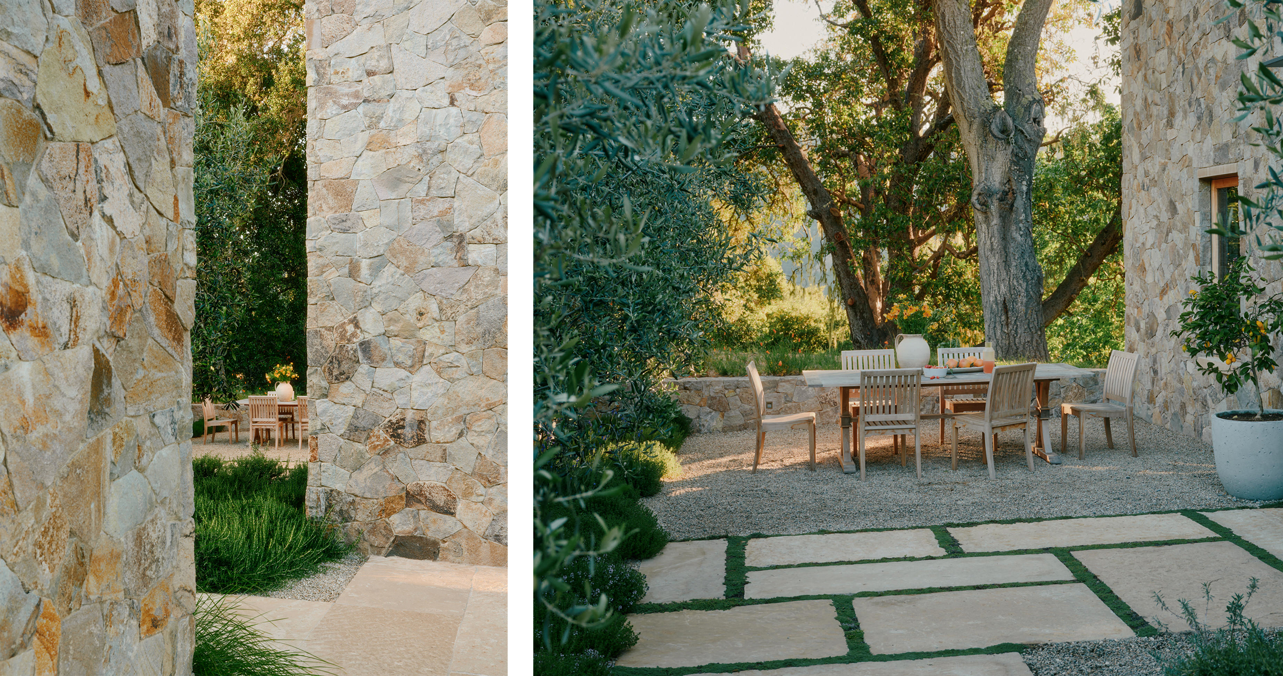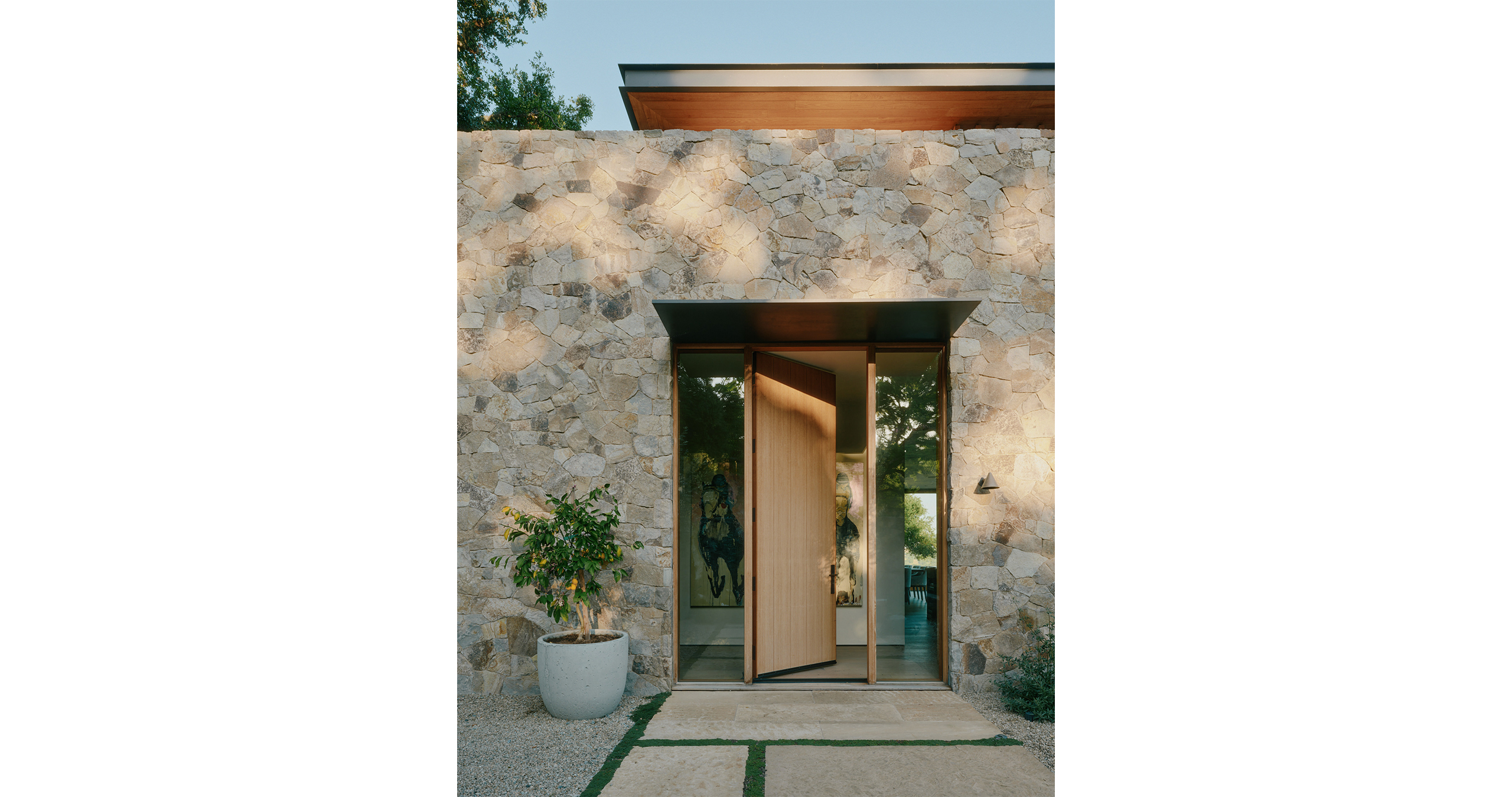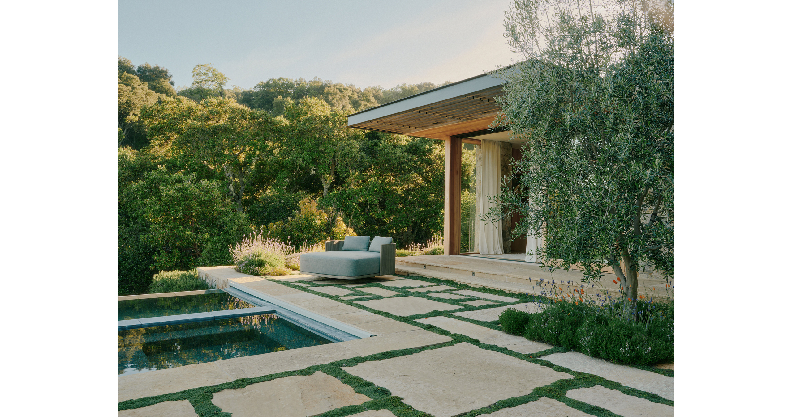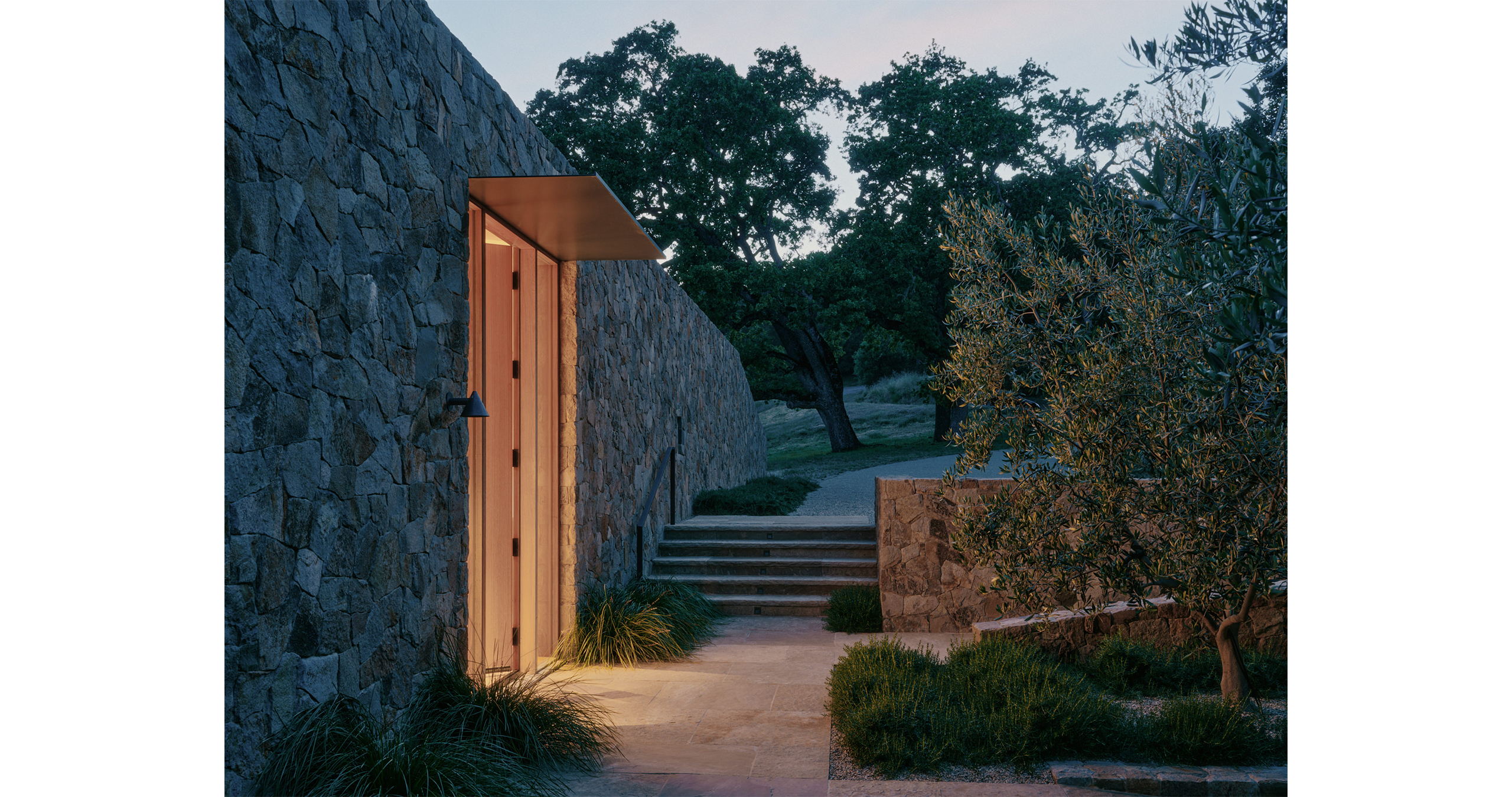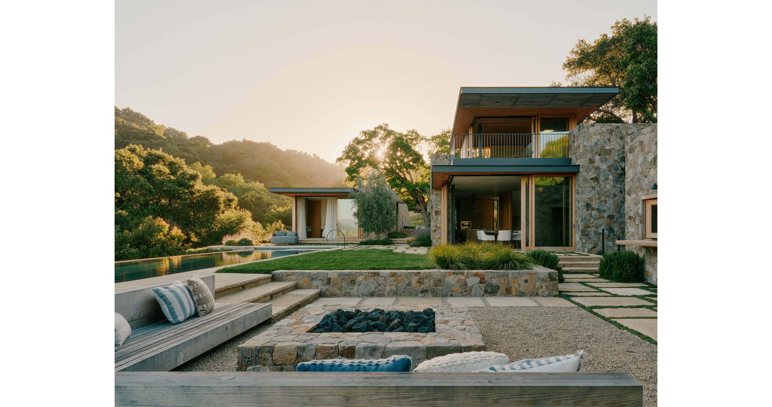 Locally-sourced hardscape materials were carefully selected to create a harmonious balance with the architecture and reduce the project’s carbon footprint. The result is an effortless flow between the landscape and structures with a timeless connection to the site.