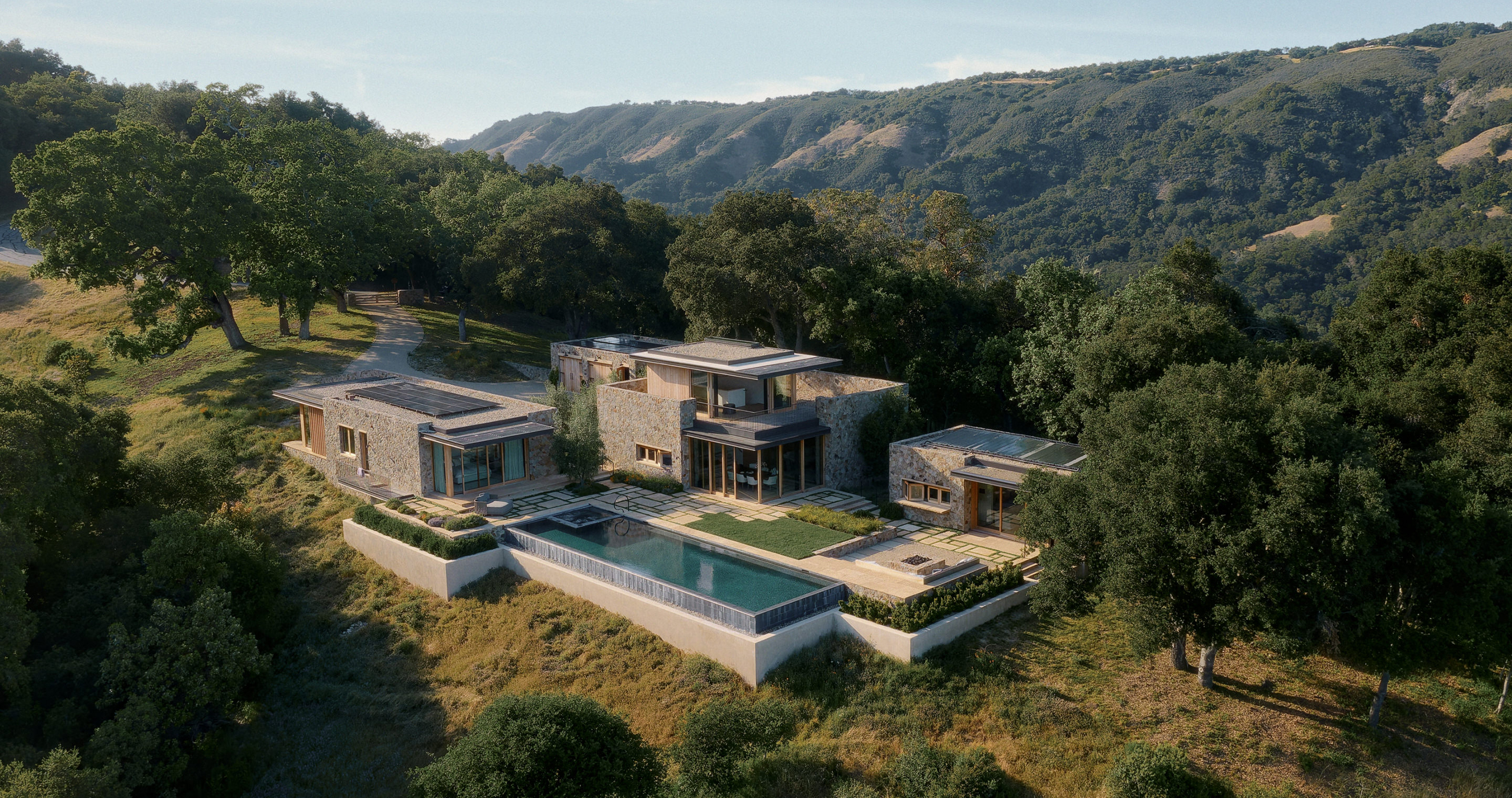 Gently cascading down a narrow ridgeline in the Santa Lucia Preserve, this compact compound makes the most of its expansive views by nestling among the native oak canopies. The site plan was carefully considered to minimize the new home’s impact on the landscape, using subtle elevation changes to create interest in the garden and reduce the amount of grading required. The result is a gently terraced home and garden that allows the daily life of its owners to easily flow between the cozy structures.