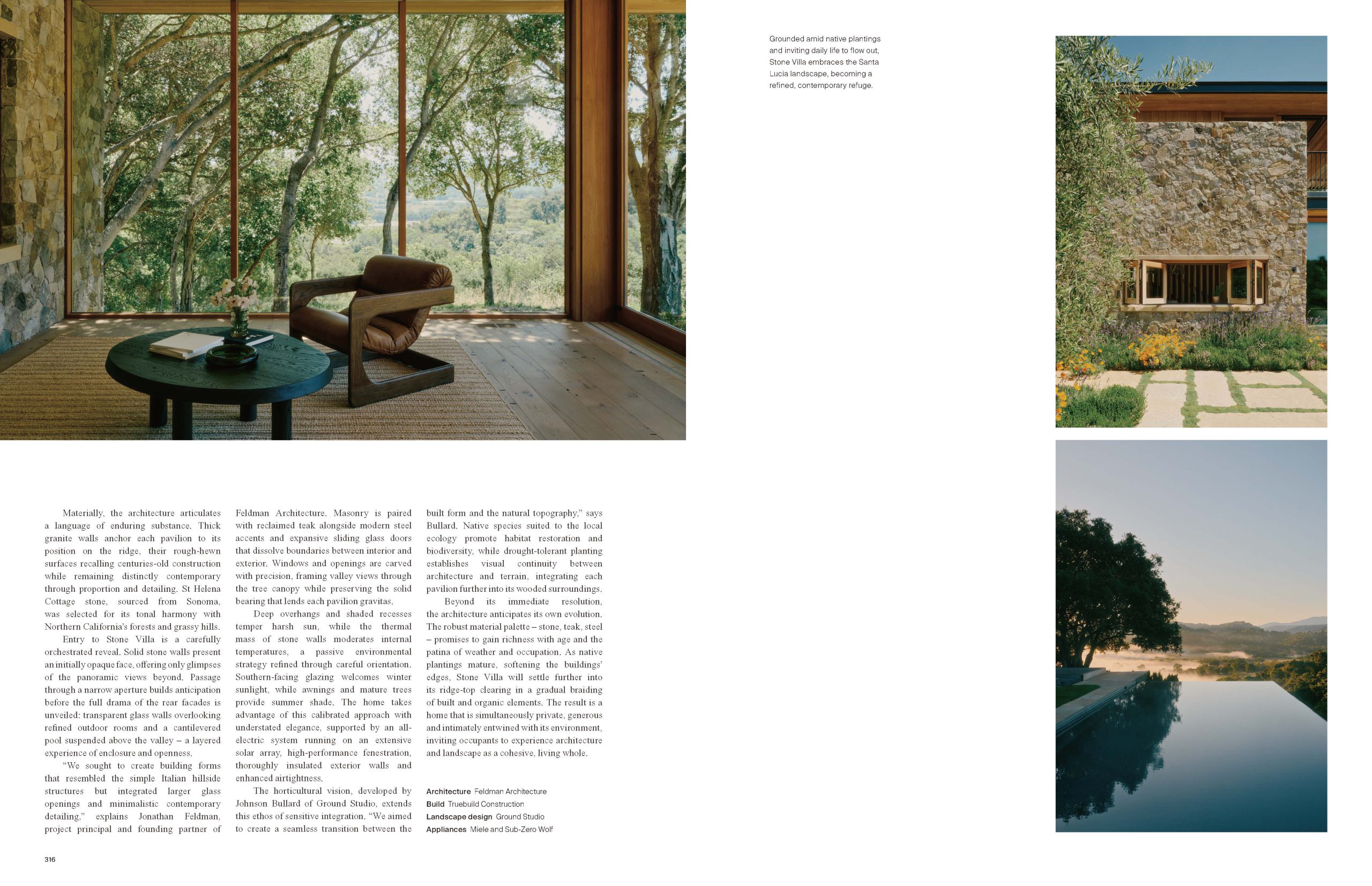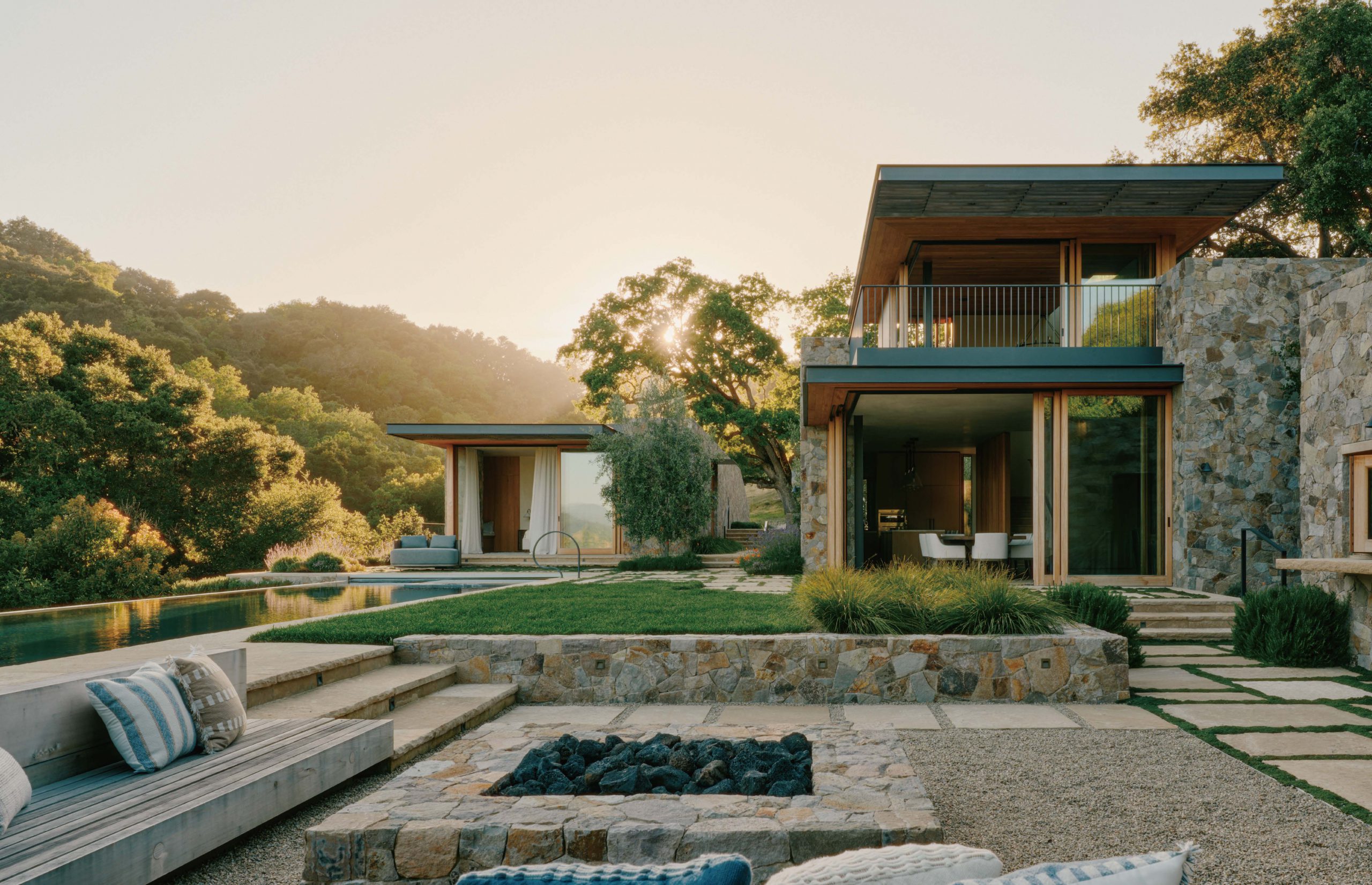 Materially, the architecture articulates a language of enduring substance. Thick granite walls anchor each pavilion to its position on the ridge, their rough-hewn surfaces recalling centuries-old construction while remaining distinctly contemporary through proportion and detailing. St Helena Cottage stone, sourced from Sonoma, was selected for its tonal harmony with Northern California’s forests and grassy hills.